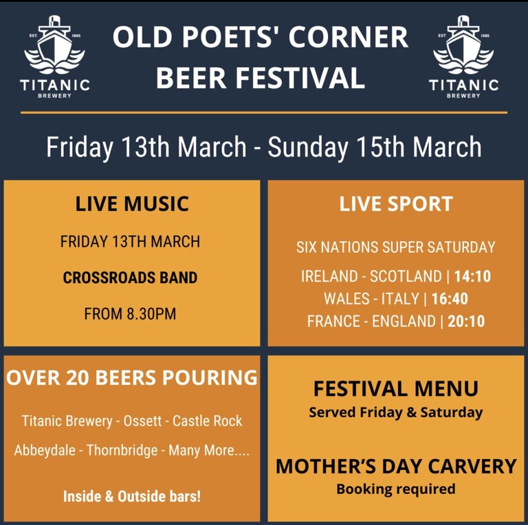- Old Poets' Corner Beer Festival Friday 13 – Sunday 15 March 2026