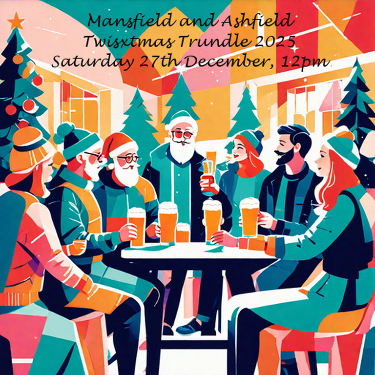 Our regular Mansfield Twixtmas Trundle will return this year on Saturday, 27th December, starting at 12pm in the Railway Inn. From here, we'll go to Stella Taps, Brown Cow, Stag & Pheasant and The Garrison. We'll aim to be at each one for around an hour, but update Facebook on the day should you wish to join us along the route.