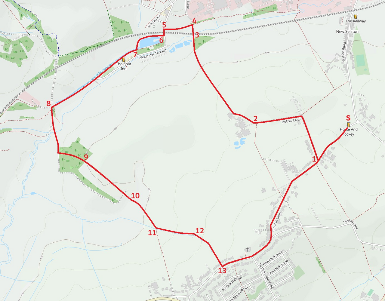 From the Horse & Jockey (S), head southwest along Church Lane for approx. 250m before turning right onto Hobsic Lane (1). After 250m, follow the road round to the left, proceeding another 250m towards the farm buildings (2). Just before the entrance to the farm, take the track to the right, which skirts the outside of the farm, before continuing on the footpath across the fields towards Pinxton. At the end of the field, continue along the tree-lined path before arriving at a railway line (3). Cross over and follow the path for another 30m before turning left (4) and following the path until you arrive at Alexander Terrace (5). Turn left and cross the level crossing before turning immediately right into Pinxton Wharf (6). Follow the path on the north side of the lake, crossing the bridge, then turn right, keeping the canal to your right (7). Passing the Boat Inn on your left, keep to the track for 250m, then go through the squeezer before taking the track straight ahead and continuing for another 270m. At the junction of paths (8), turn left and head south for 230m before veering left and heading towards the gate (9). Continue through the field for 400m, heading southeast along the footpath, aiming for the gap in the hedge opposite (10). Follow the path across the next field for 50m, then the following field for 150m, keeping the boundary to your right. At the corner of the field (11), turn left and continue for 200m, again keeping the boundary on your right. Go through the hedge into the next field (12), then into another field, before heading up the hill towards the houses. Follow the footpath between the houses, which ends at Church Lane (13), where you can turn left and follow the road all the way back to the Horse and Jockey (S).