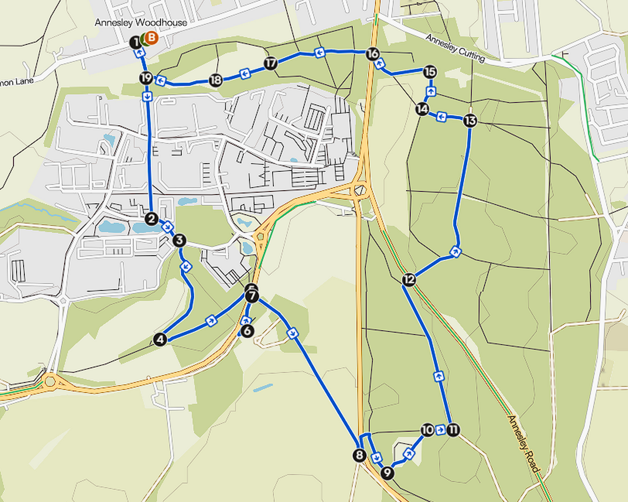 From the Moody Squires, head west along Forest Road for approx. 120m before turning south onto the footpath (1). Follow the footpath gently downhill for approx. 700m, crossing Little Oak Drive along the way. Upon reaching Lake View Drive (2), turn left and follow the road for 150m until you reach the second junction (3), then take the footpath uphill into the woods. Follow the meandering path through the wood for approx. 420m before turning sharply left onto another footpath (4). You’ll climb over a fallen tree and pass a rusting metal ‘footpath’ sign before descending gently to the Ice House (5). Go past the stile and cross over the road (there's a central reservation), then turn right and follow the road for approx. 160m to Annesley Old Church (6). Take as long as you like here before retracing your steps back along Mansfield Road, before turning south onto Dog and Bear Lane (7). Follow the track for 200m before turning onto the footpath straight ahead and following it across the fields to Annesley Road (8). Cross the road and turn left then right into the wood, then right again at the immediate junction. Follow the path for approx. 120m before turning left (9) and heading up the slope into the clearing. Take the wide path to your right and follow it to the opposite side of the clearing, then reenter the wood and turn almost immediately right (10). After approx. 100m the path will join a wide track - turn left and follow it north for approx 600m where it will turn right and alight at the A611 (12). Cross over and proceed up the track opposite and stay on this for approx. 730m before turning left onto a smaller footpath (13). Follow the path for 200m, where you will reach the edge of the wood (14). Turn right and follow the path along the edge of the wood/field boundary, turning left at the corner of the field (15). After approx. 300m the path away from the field, eventually alighting at Derby Road (16). Cross the road and proceed into another wood opposite, and follow the path straight ahead for approx. 400m. Carry on past the steel barrier and keep straight ahead for approx. another 480m, where you will arrive at the footpath you were on at the start of the walk (19). Turn right and walk back along the footpath to Forest Road before turning right and arriving back at the Moody Squires.